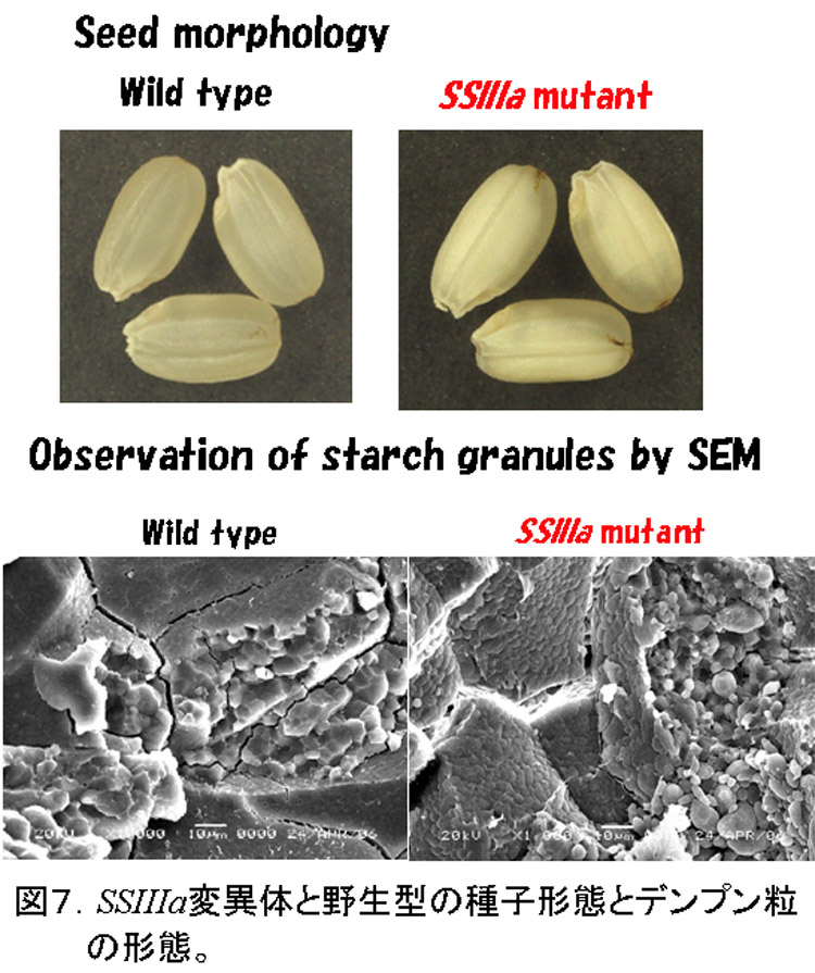 SSIIIaは、SSIに次いでイネ登熟胚乳の可溶性画分の約20-30%を占める(図2)主要なSSである。このアイソザイムの変異体は、トウモロコシのdull-1変異体が古くから知られていたが、イネでは単離されていなかった。我々は、SSI変異体を単離した方法と同様の方法で、SSIIIa変異体を単離した(Fujita et al., 2007)。この変異体は、種子が心白になり、澱粉粒は、丸い(図7)。アミロペクチンの鎖長分布は、DP40以上の長鎖が著しく減少しているため(図8)、SSIIIaの機能が、アミロペクチンのクラスター2個以上をつなぐ長い鎖を伸長すると推察できる。また、SSIIIaが欠失する代わりに、SSIとGBSSIの発現量が増加する(図9)ため、アミロペクチンの短鎖の鎖長分布が変化し(図8)、アミロース含量、アミロペクチンの超長鎖が増加した(図10)。これらの構造変化は、澱粉物性の劇的な変化(図11)の原因になっていると考えられる。